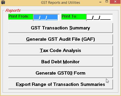 If you wish to generate the GST transaction summary, please fill in the dates and then click the GST Transaction Summary button. As usual, you may also double-click on the Print From and Print To fields, to select dates from a list.